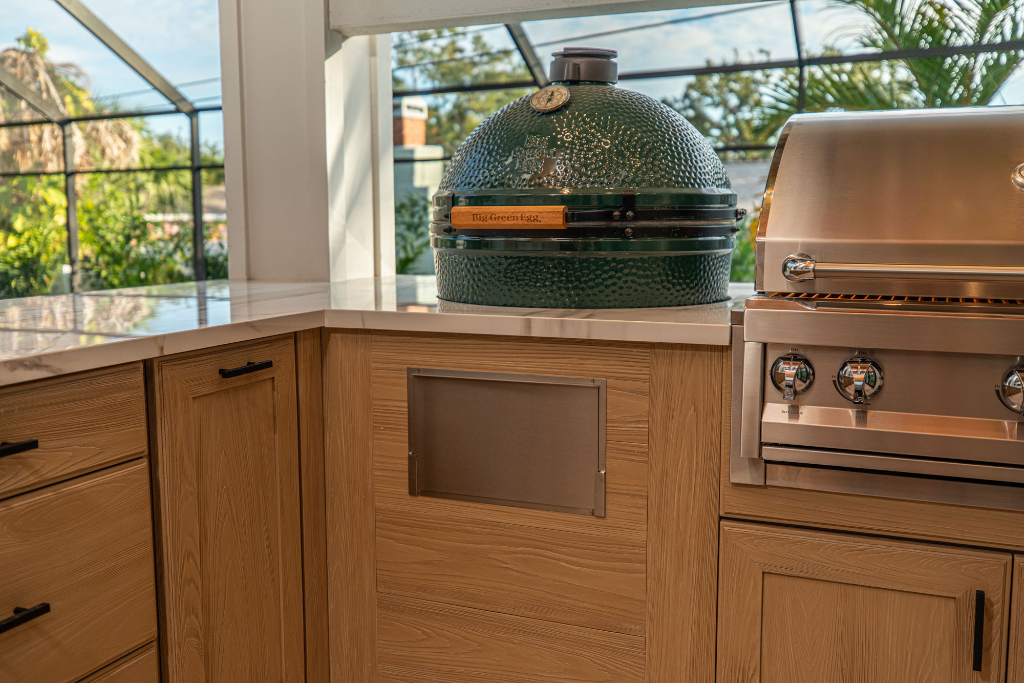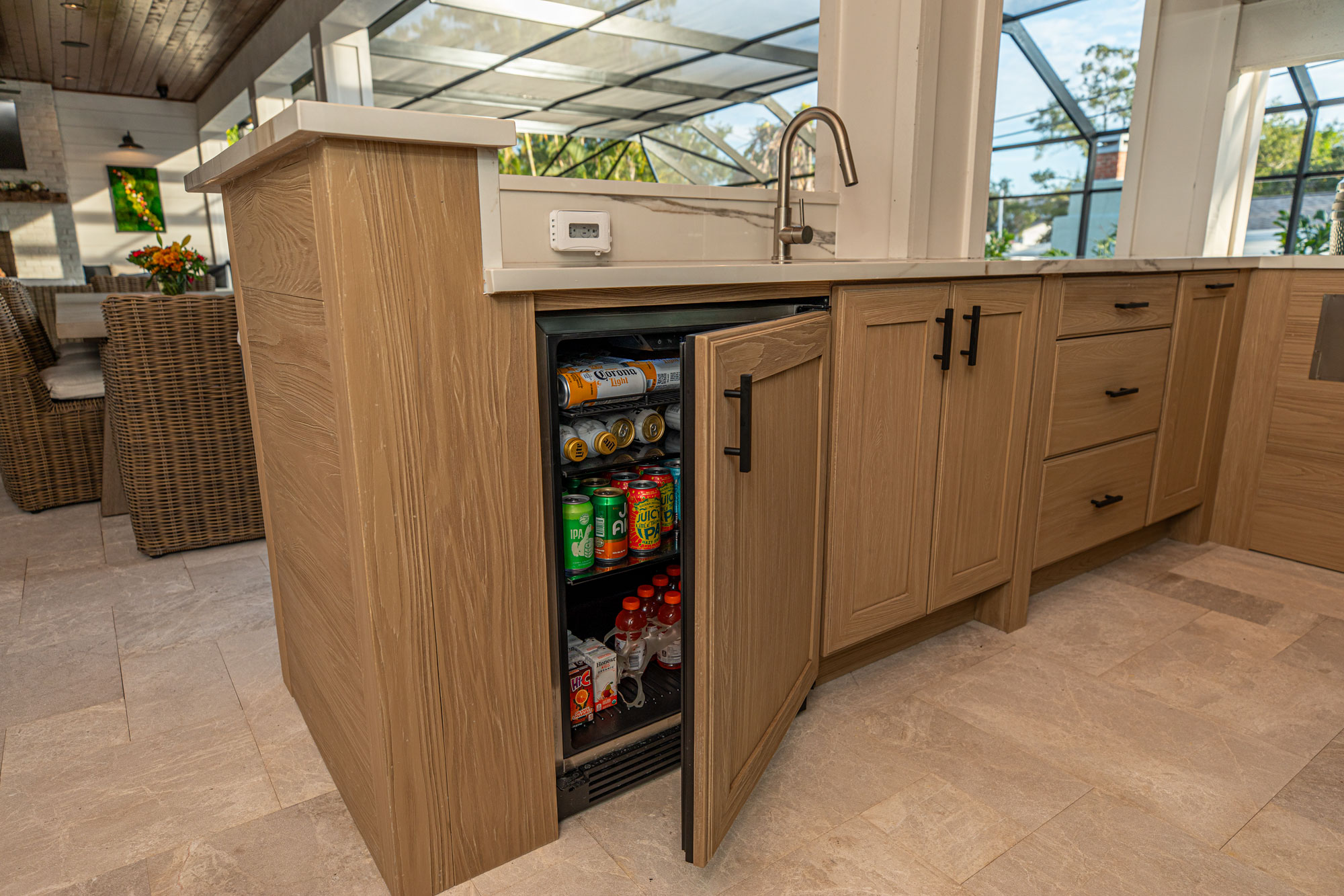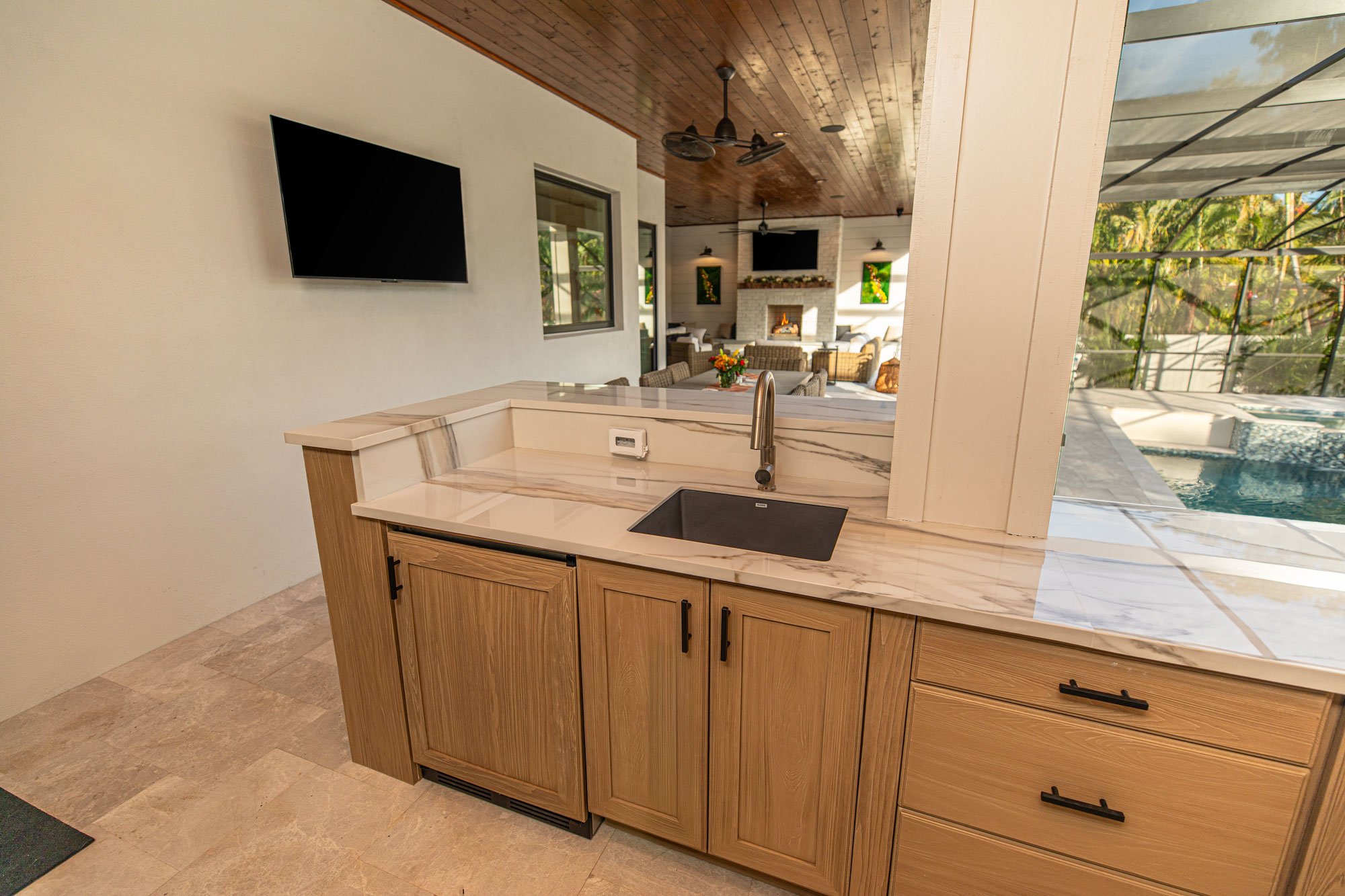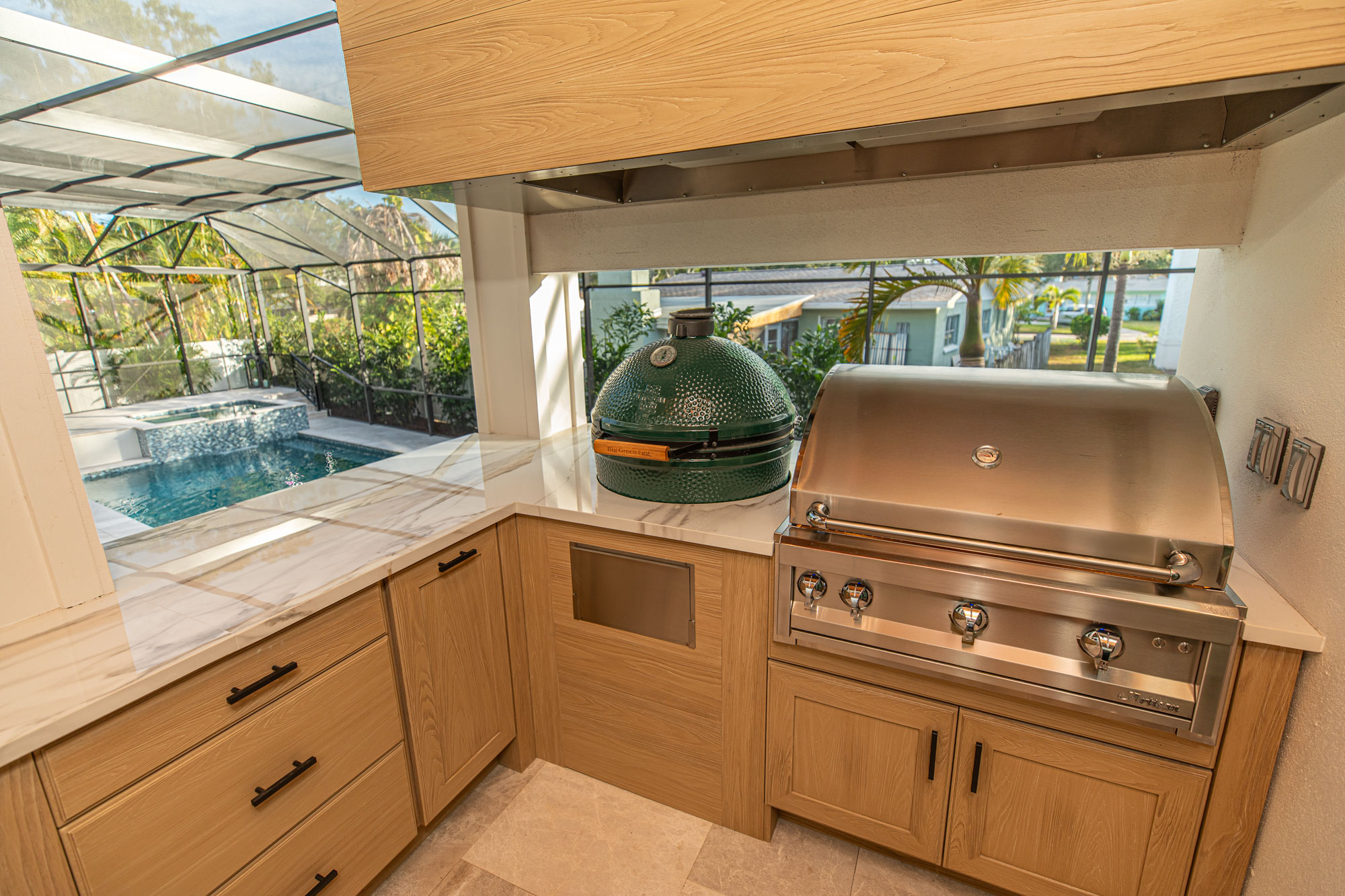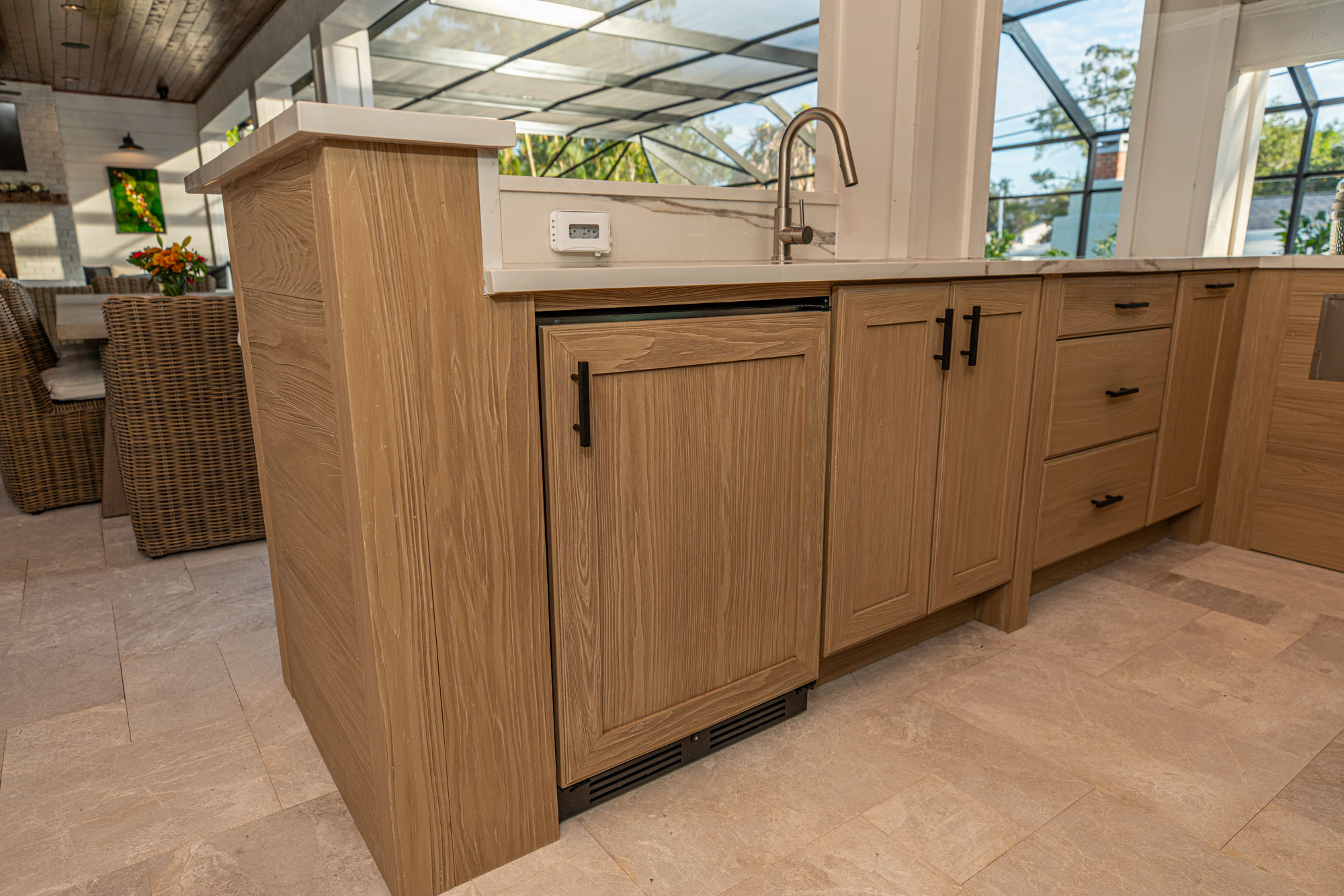 This outdoor kitchen features custom-built, outdoor-rated polymer cabinetry designed specifically for the project. The cabinets mimic the beauty of real wood with a sleek White Rift Oak finish, delivering the durability Florida’s climate demands while maintaining a modern, elevated look.