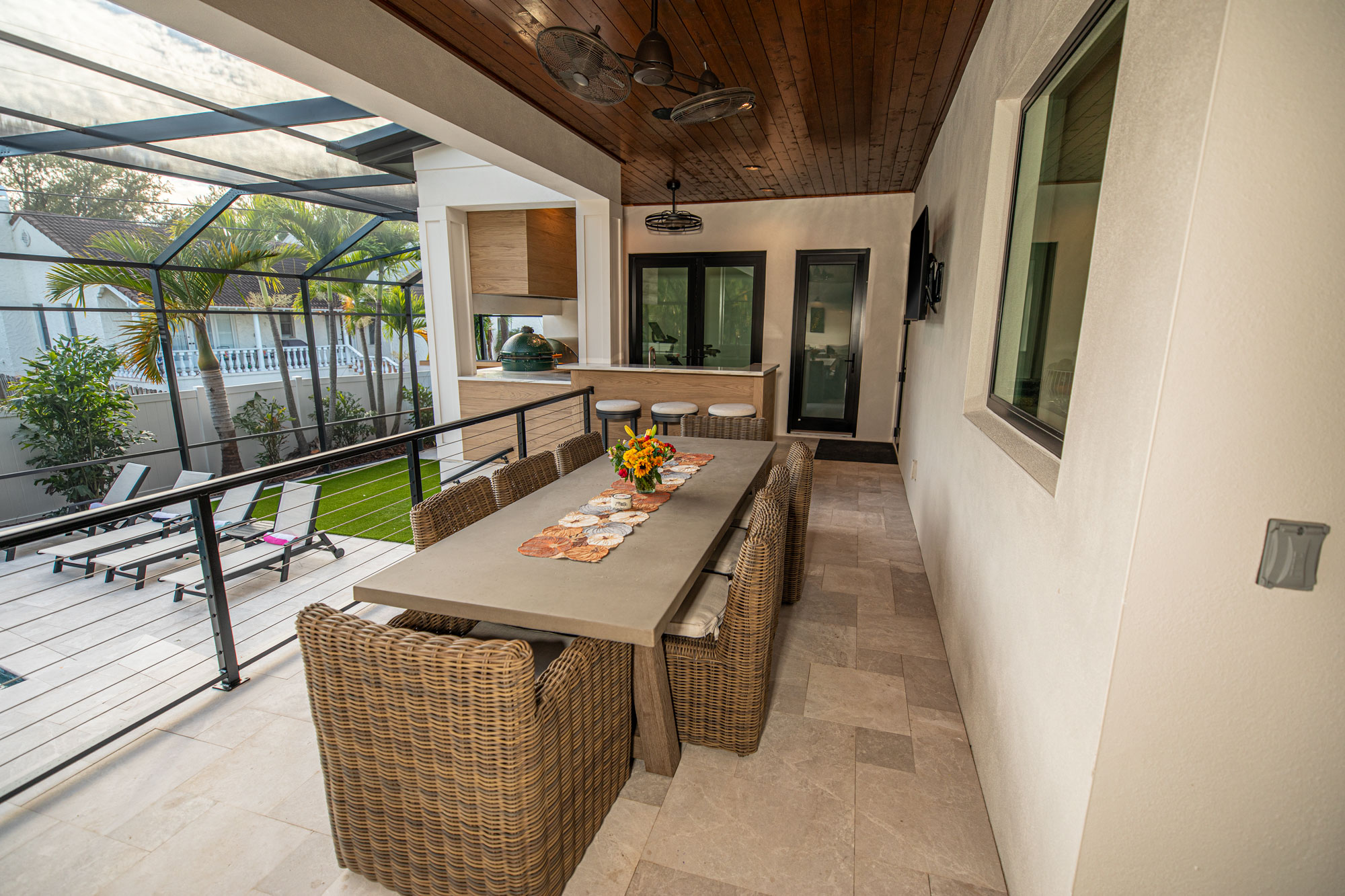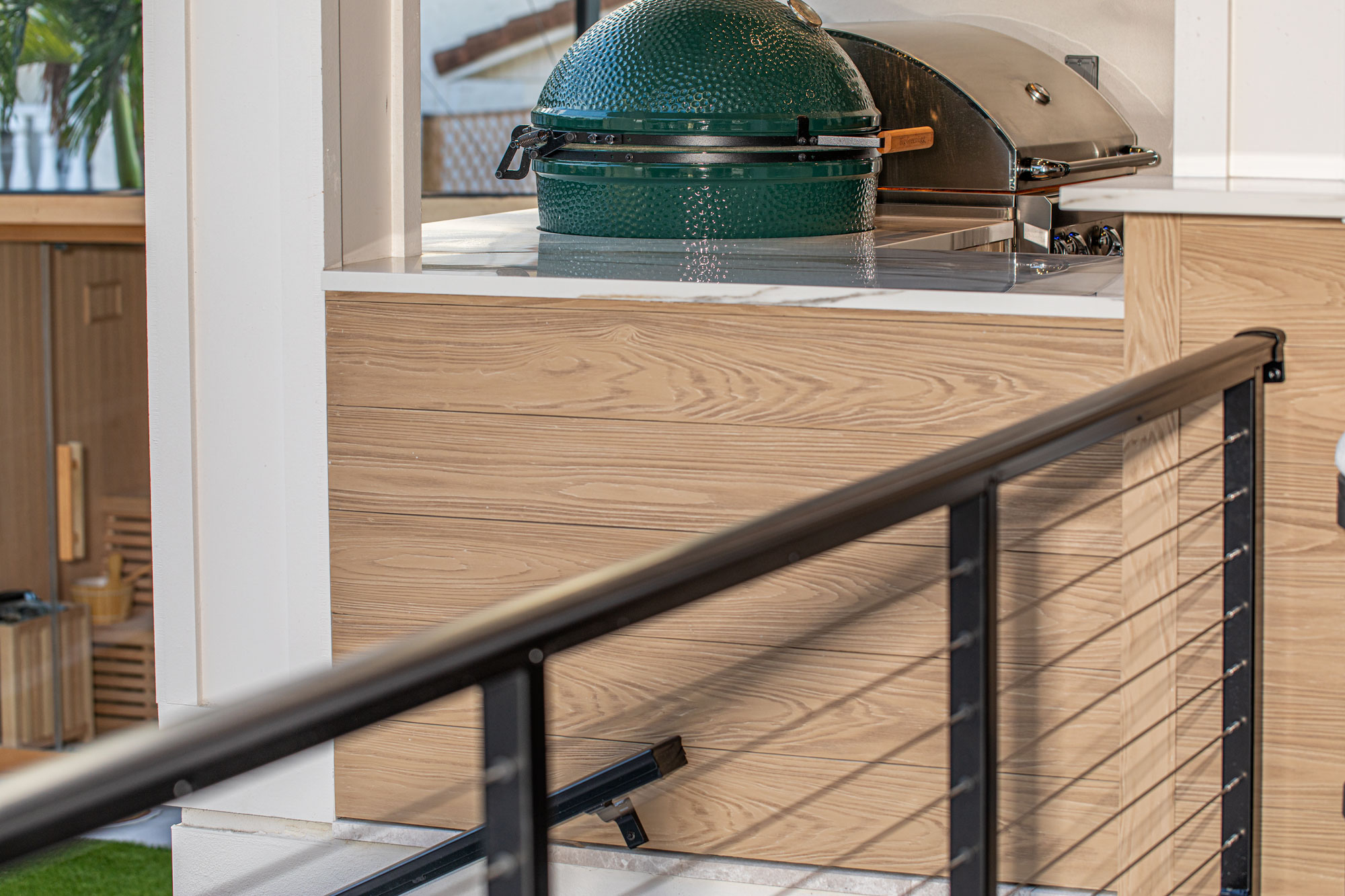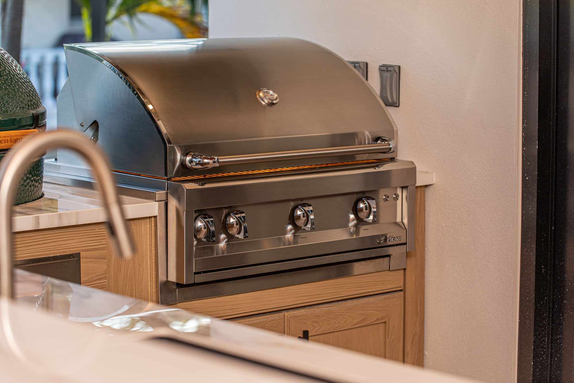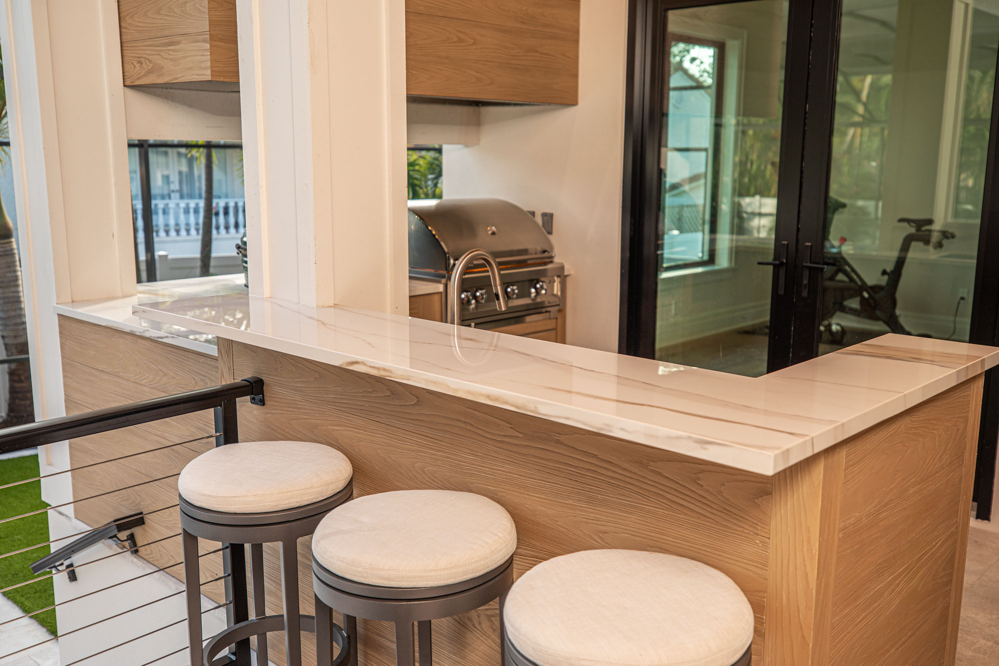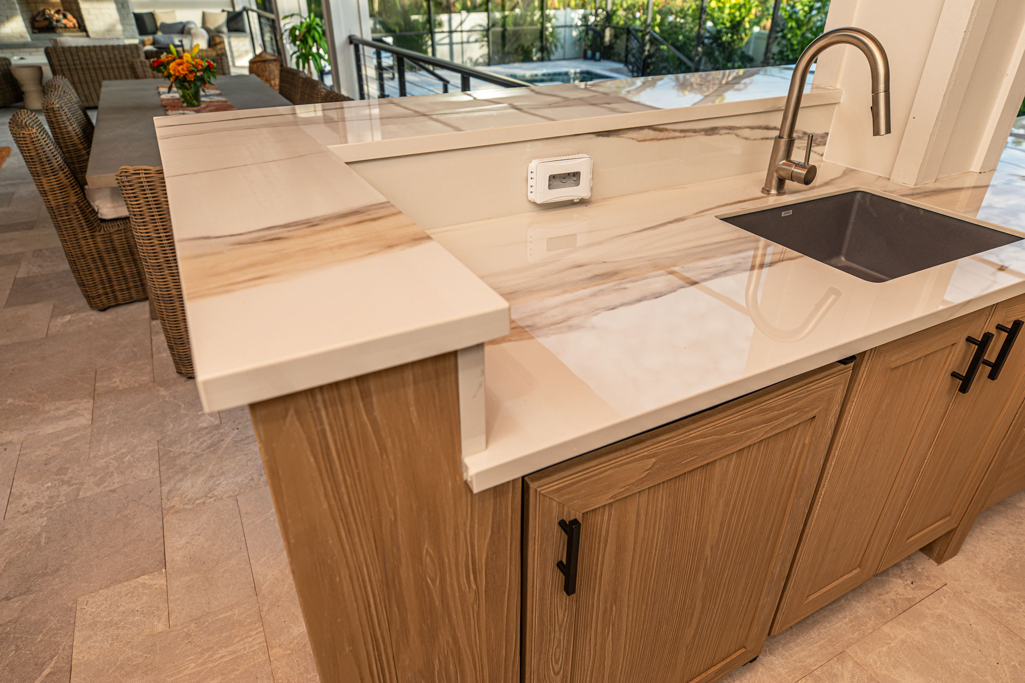 This outdoor kitchen features custom-built, outdoor-rated polymer cabinetry designed specifically for the project. The cabinets mimic the beauty of real wood with a sleek White Rift Oak finish, delivering the durability Florida’s climate demands while maintaining a modern, elevated look.
