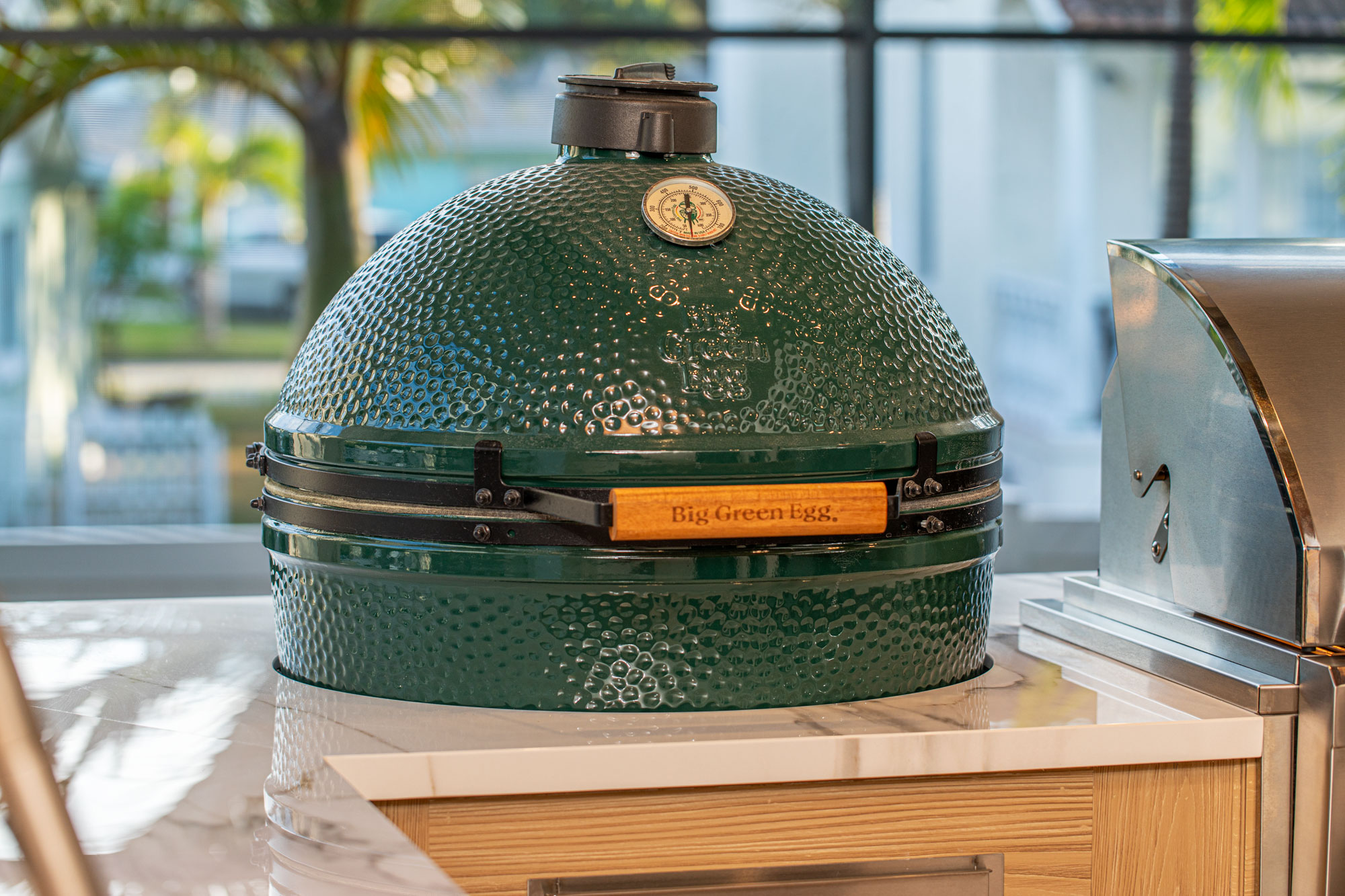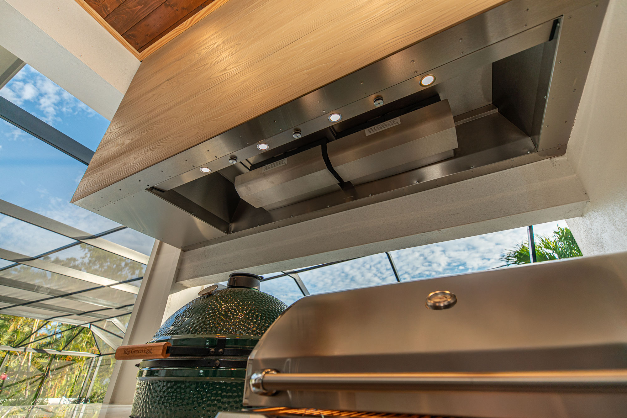 Premium cooking appliances complete the space, including an Artisan Gas Grill and a Big Green Egg kamado-style grill, giving the homeowner versatility for every type of outdoor cooking. Above the grilling station, our team installed a custom Vent-A-Hood outdoor range hood, ensuring proper ventilation and adding a statement design element. A panel-ready outdoor refrigerator blends seamlessly into the cabinetry for a clean, built-in appearance.