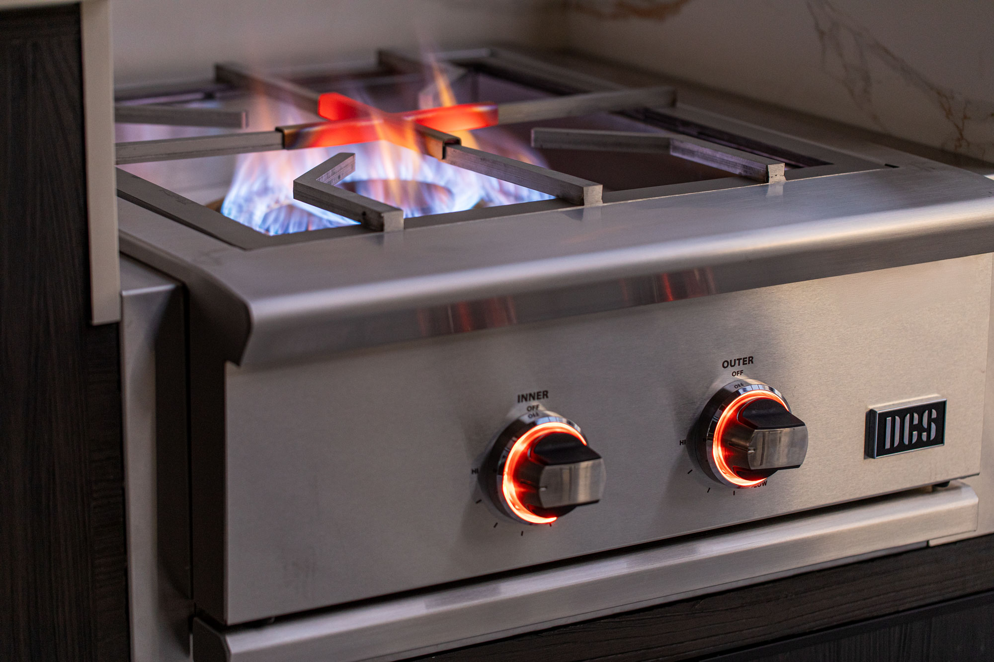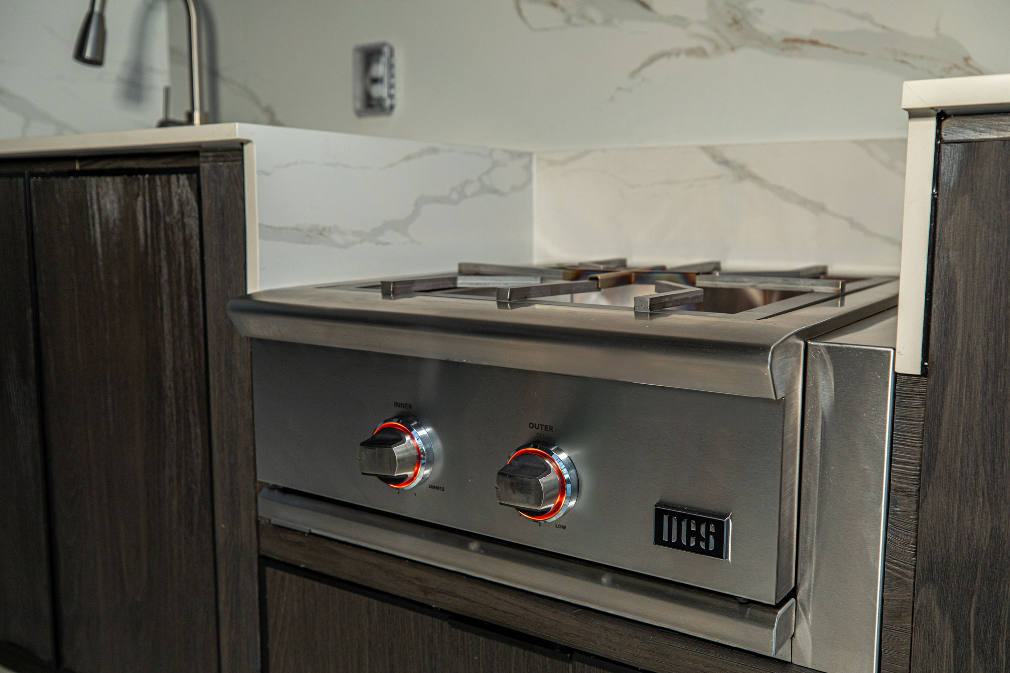 The outdoor kitchen features professional-grade DCS Appliances, including a Series DCS Grill and a powerful Series 9 Power Burner for restaurant-quality cooking at home. Additional upgrades include an integrated sink, pull-out trash drawer and a panel-ready outdoor refrigerator that seamlessly matches the cabinetry.