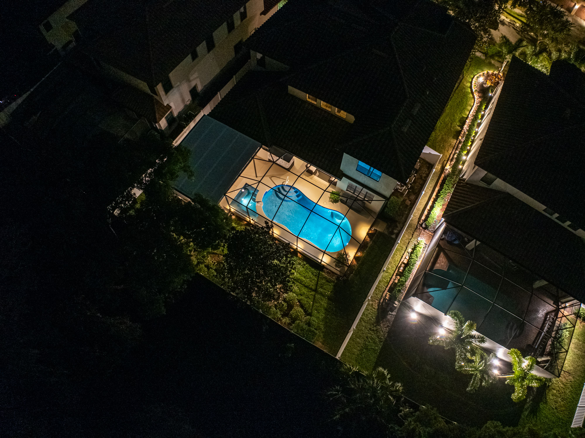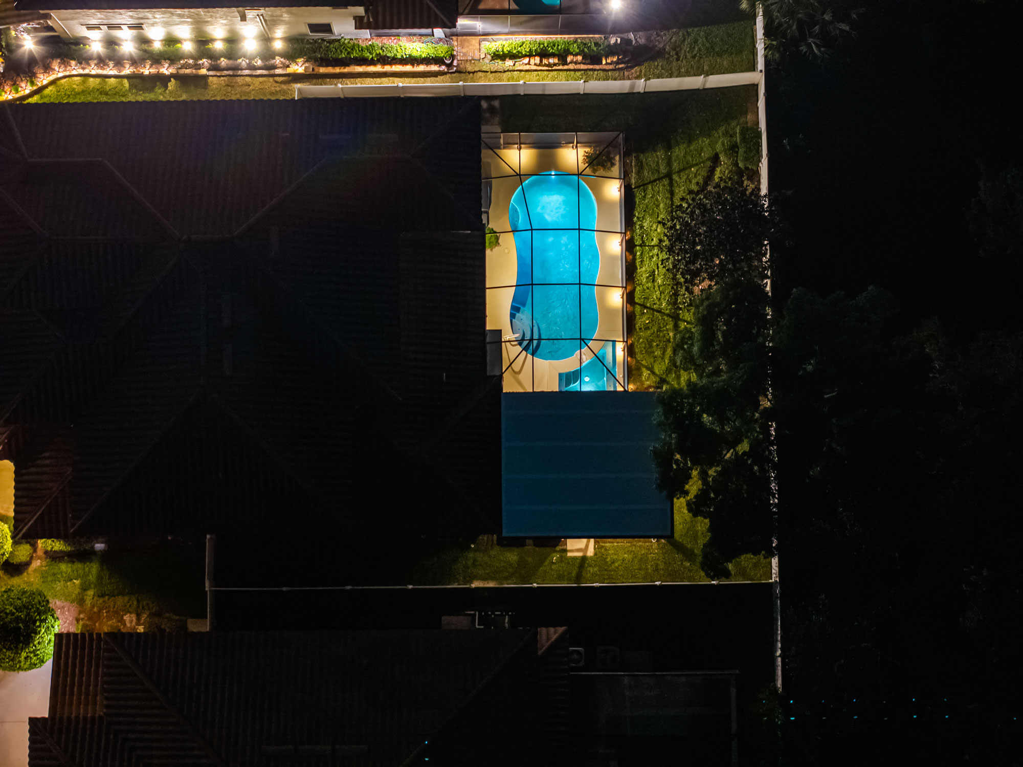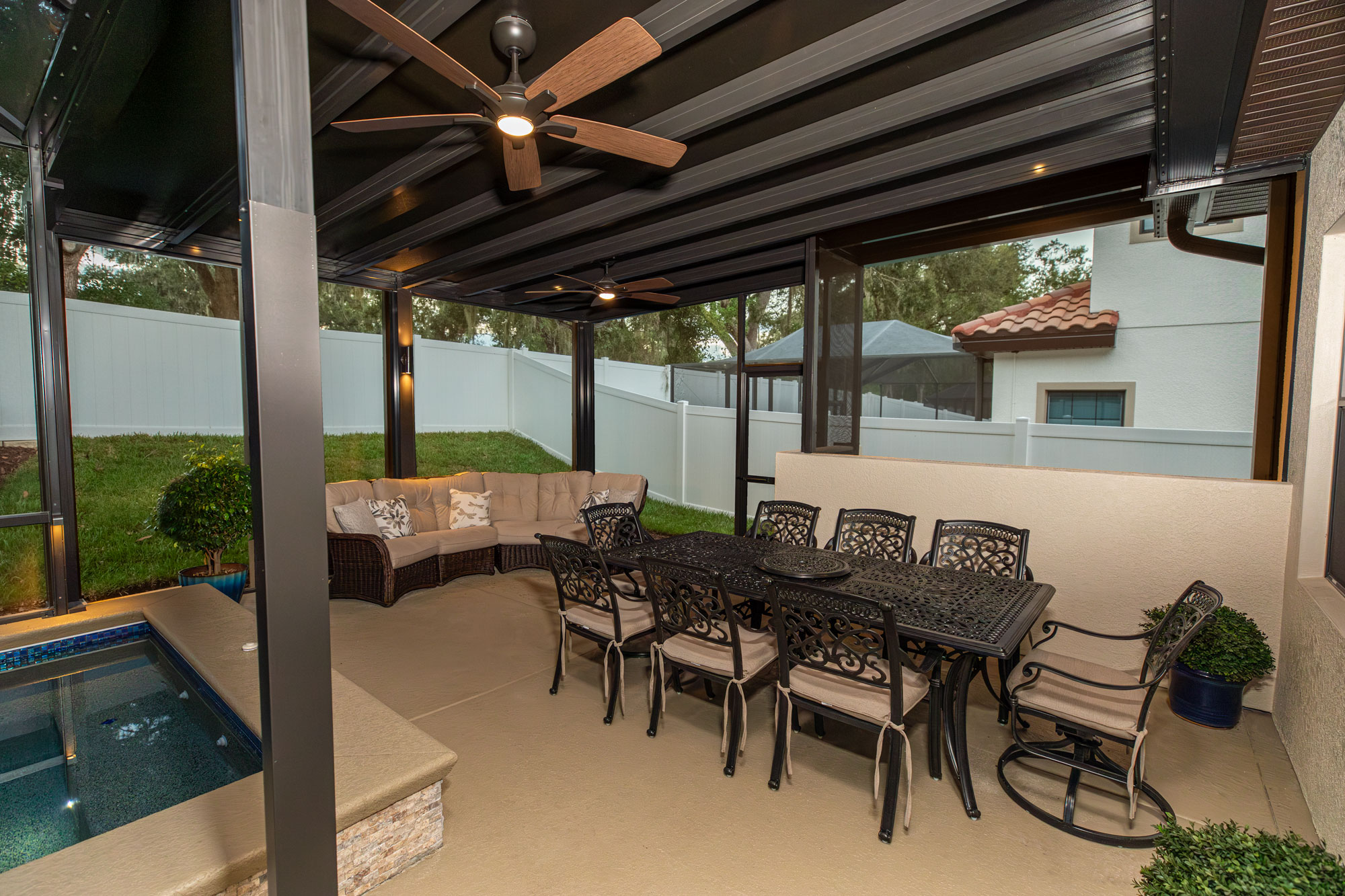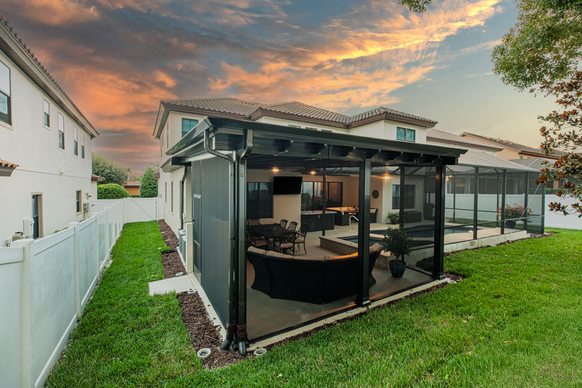 To elevate nighttime ambiance, we incorporated landscape lighting along the pool cage and pergola. Soft illumination enhances architectural lines, adds depth to evening views, and creates a resort-style atmosphere after sunset.