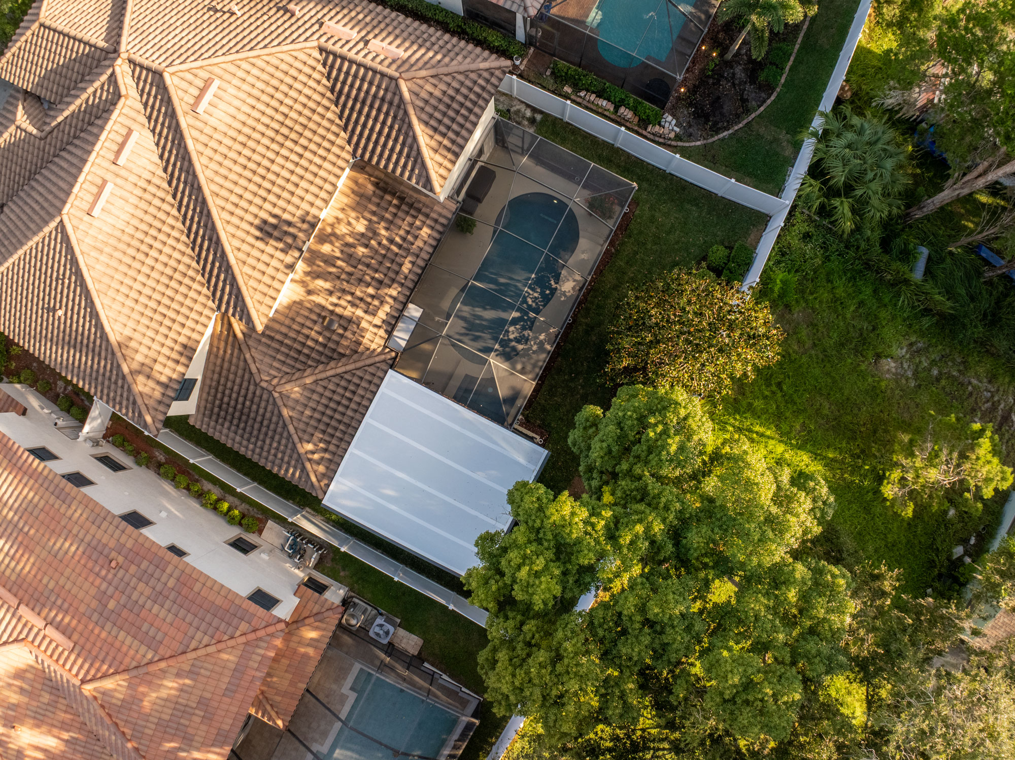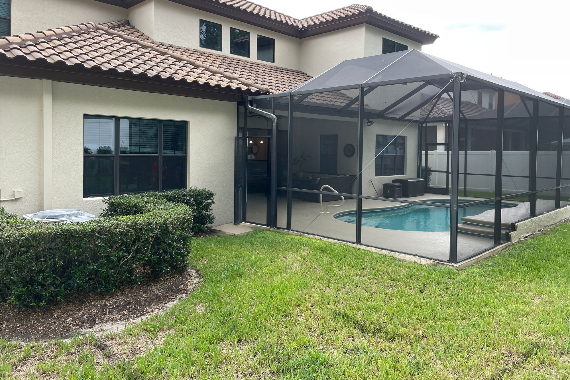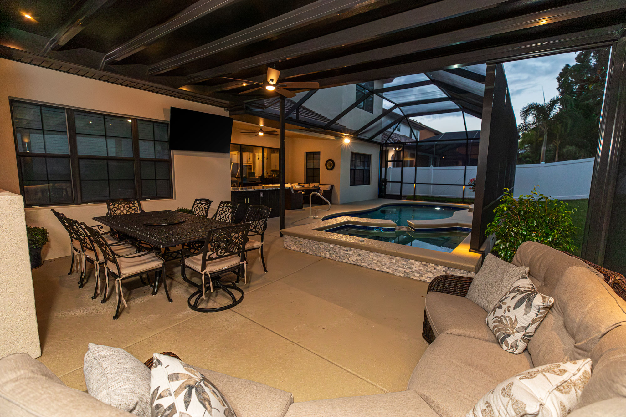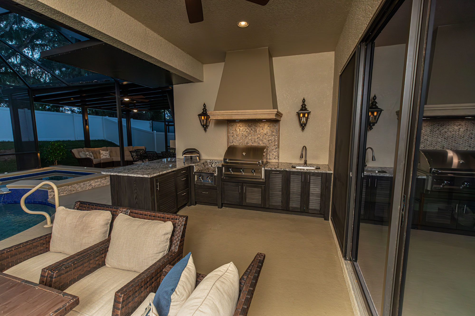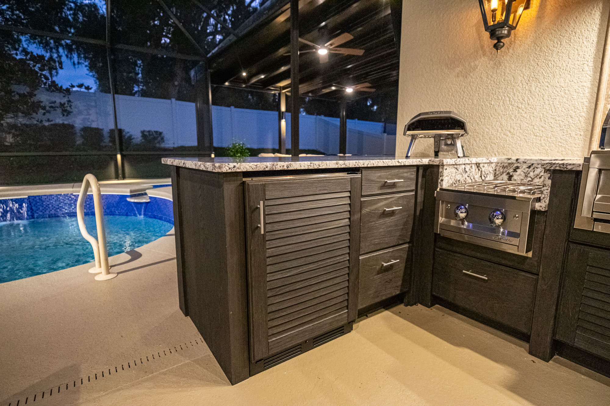 To elevate nighttime ambiance, we incorporated landscape lighting along the pool cage and pergola. Soft illumination enhances architectural lines, adds depth to evening views, and creates a resort-style atmosphere after sunset.