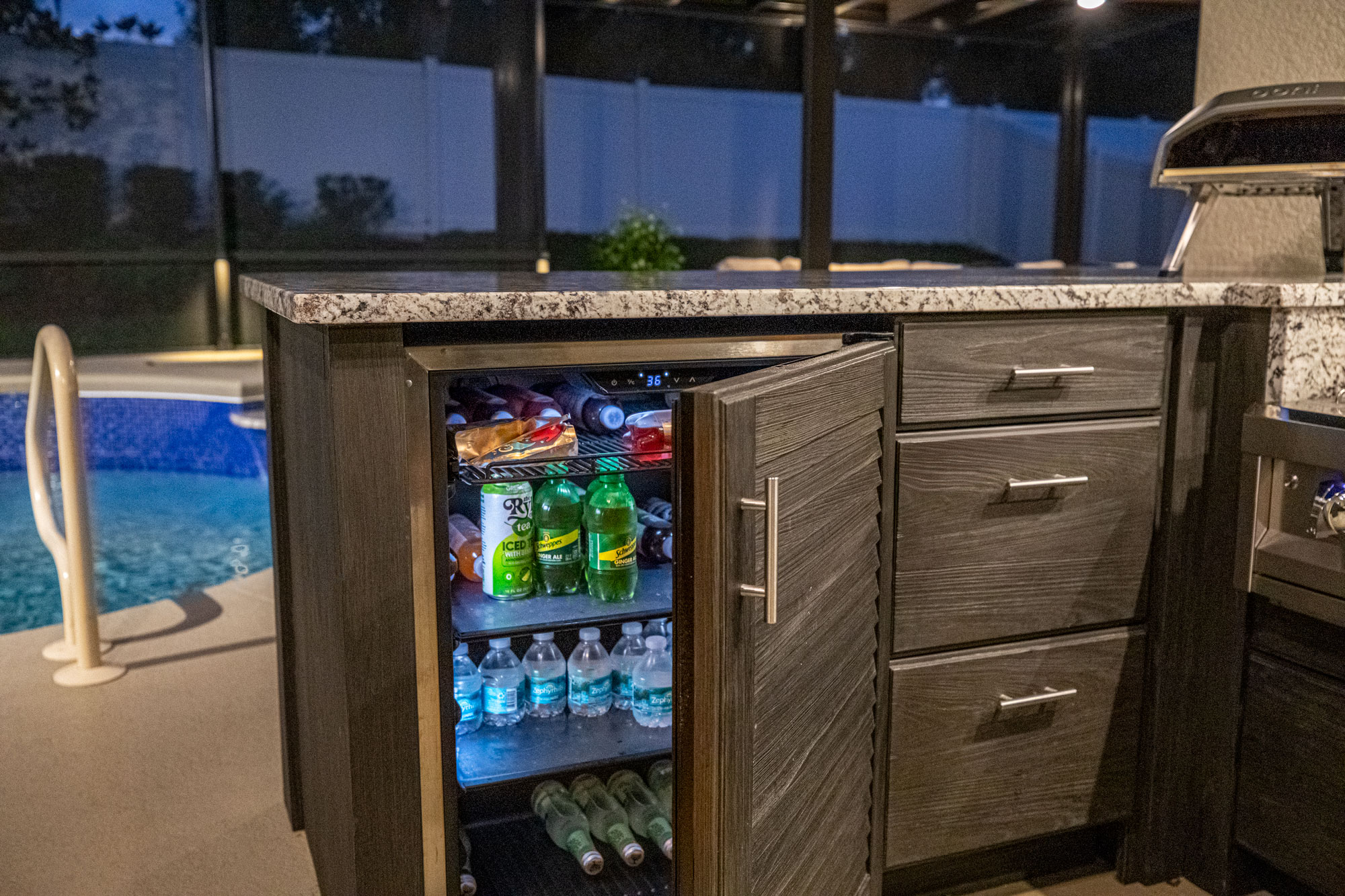 Anchoring the entertainment area is a bespoke L-shaped outdoor kitchen featuring premium Artisan Grill appliances. Outfitted with a gas grill, power burner, pizza oven, and panel-ready outdoor refrigerator, this kitchen blends performance with visual cohesion. A custom ventilation hood with handcrafted coping and a tiled backsplash deliver a designer finish typically reserved for luxury interiors. Accent wall lighting adds ambiance for nighttime hosting.